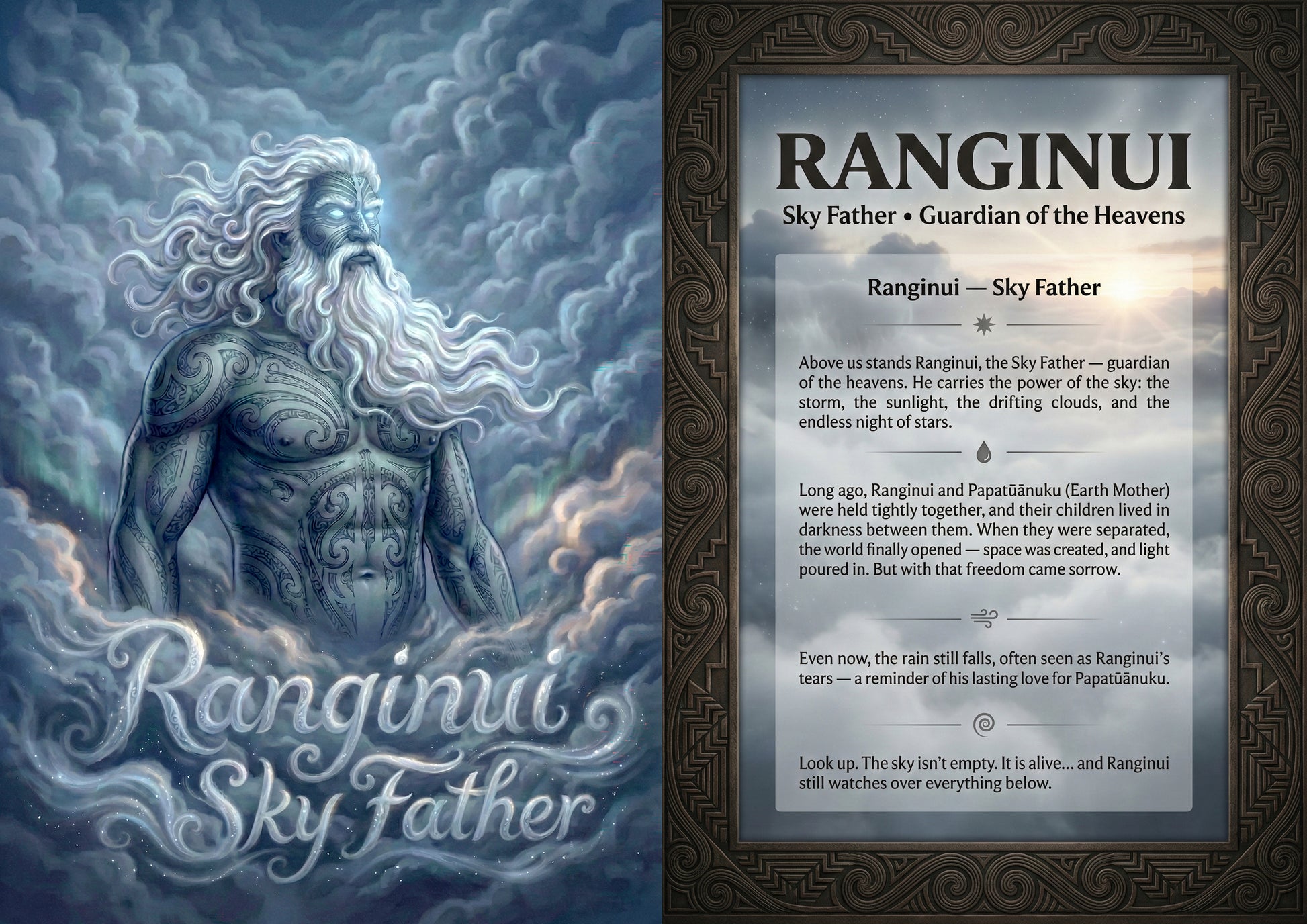 Each board highlights a different kaitiaki, including Ranginui, Rehua, Tūmatauenga, Rongomātane, Haumiatiketike, Tangaroa, Tāne Mahuta, Tāwhirimātea, Papatūānuku, and Rūaumoko.